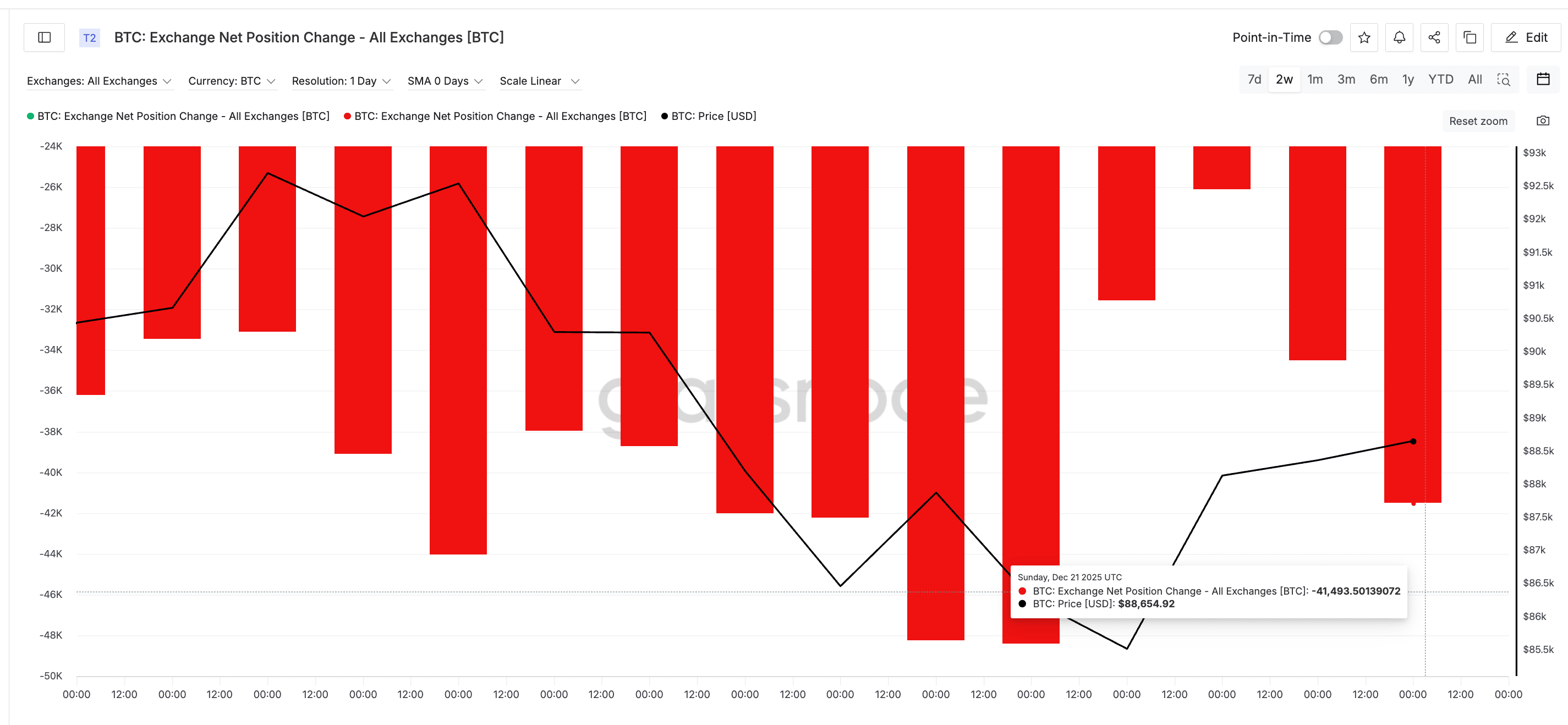 As of December 19, the outflow from Bitcoin exchanges was approximately 26,098 BTC. By December 21, the outflow surged to 41,493 BTC. The net outflow increased by 59% over these two days.