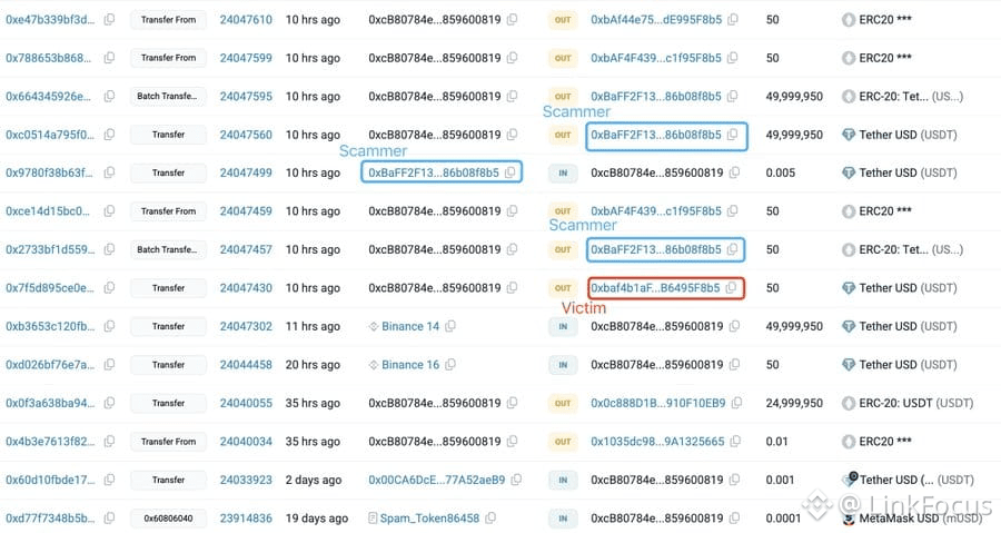 测试交易与诱饵布置:受害者是一位谨慎的交易员,在进行大额转账前,他先从币安交易所向自己的钱包地址发送了50 USDT作为测试,以确保一切无误。