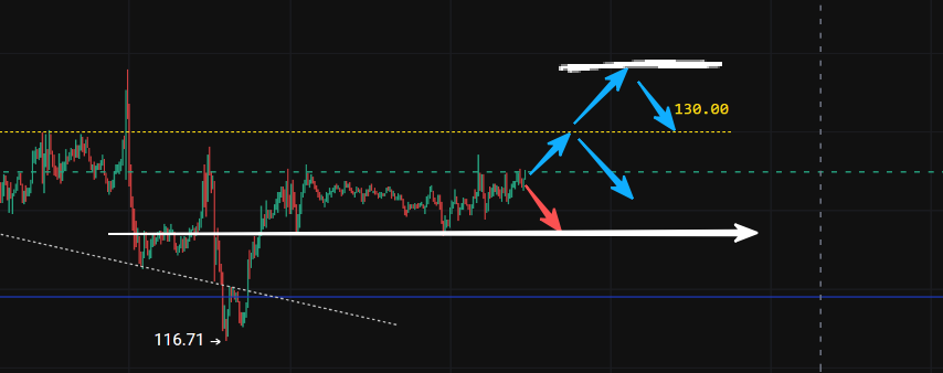 If the market reaches around 130, you can open a short position slightly, and add to the short at the white short line around 133.5-135.5 [blue route]. If it goes down along the red route, friends who want to go long can buy around 123 [white arrow], but if it breaks the white arrow, cut losses directly!