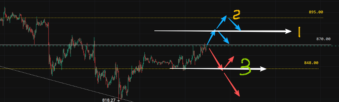 If it cannot hold 870, it will retest the red route, you can go long near 848 for the head position, betting on a rebound at the three points of the white arrow. If it breaks 848 and cannot recover, this long should cut losses directly because it will follow the downward route of the three points.