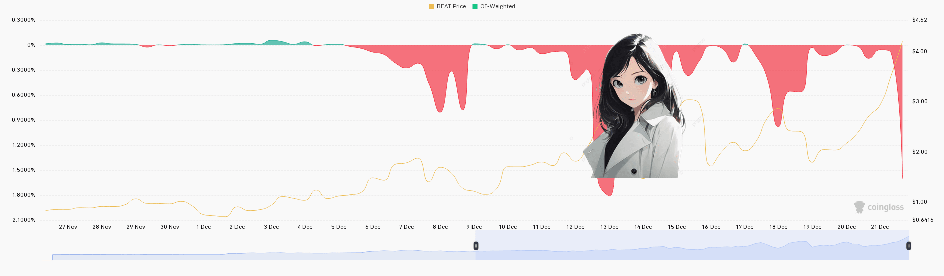 Oh my, this BEAT is really making the brothers "heartbroken" lately! Look at the overall chart, it just had a "fly up" from below $1 to nearly $4 like a rocket. Whoever caught this wave must be "grinning" and celebrating early. But pay attention to the OI-Weighted indicator, it just turned green and then immediately dropped a pile of red right at the peak price near $4, just like there's some movement! This is a sign of profit-taking or a tremendous selling pressure coming down.