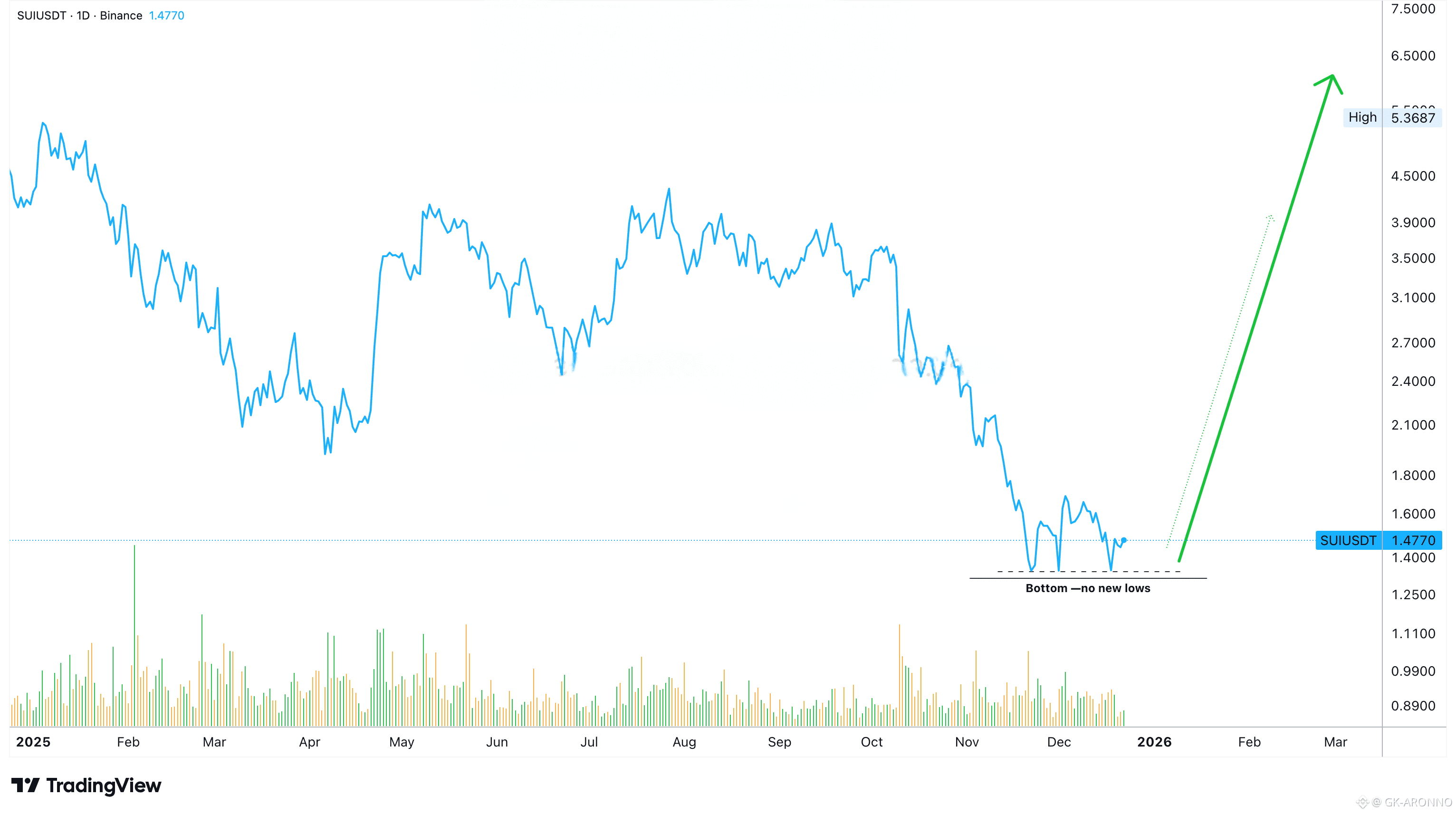 Keeping it simple with a line chart —SUIUSDT. Notice how after November there are no new lows. There is a major crash and the crash suddenly stops. It not only stops but there is no resumption of bearish action, that's it. This is telling us that the bearish wave is over.