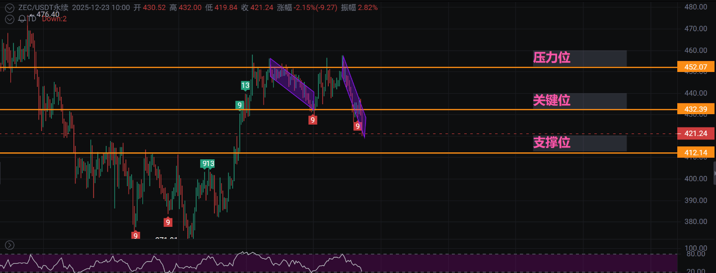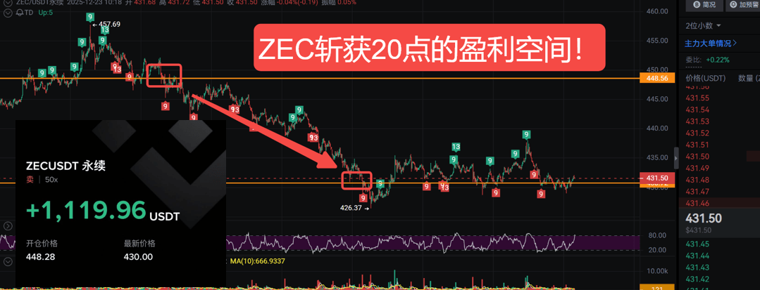 I dare say that 90% of retail investors misunderstand the signal of "three attempts to break 432 without success"! This is not about "not moving up", but rather the main force is "testing the selling pressure"! Just like a boxer feinting before throwing a punch, when the market thinks the bulls are weak, the real killer move is brewing. I predict that tonight we will break through the key level of 432, heading straight for 460 USD! But there is a key foreshadowing here—the pressure level of 452 is the true "touchstone"; if we can break through with volume, ZEC will start a major upward wave at the monthly level!