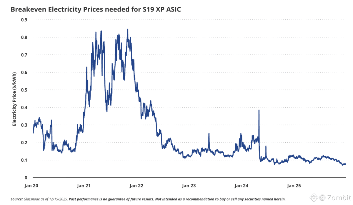 Sigel 與 Bush 進一步指出,2022 年推出、目前最主流的礦機之一 Bitmain S19 XP,其損益平衡電價已自 2024 年 12 月的每度電 0.12 美元,下降至 12 月中旬的 0.077 美元,跌幅接近 36%,凸顯當前礦工經營環境的嚴峻程度。