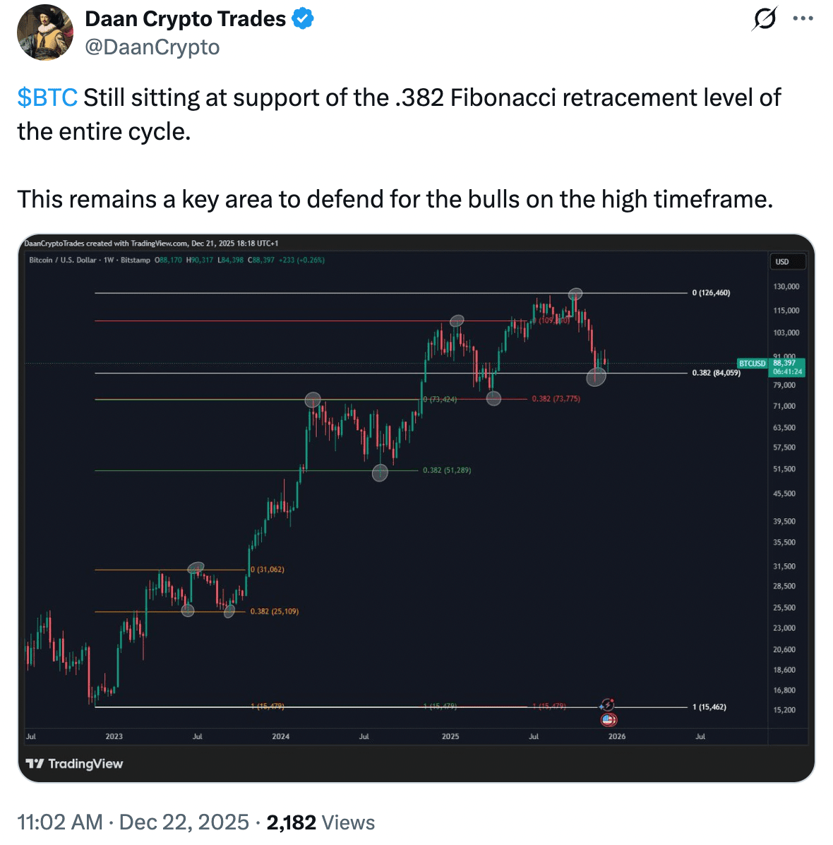 Trader and analyst Daan Crypto Trades said that $84,000 "is a key level that bulls desperately need to hold on at higher timeframes."