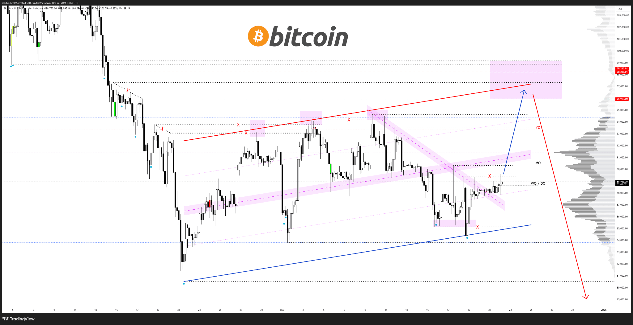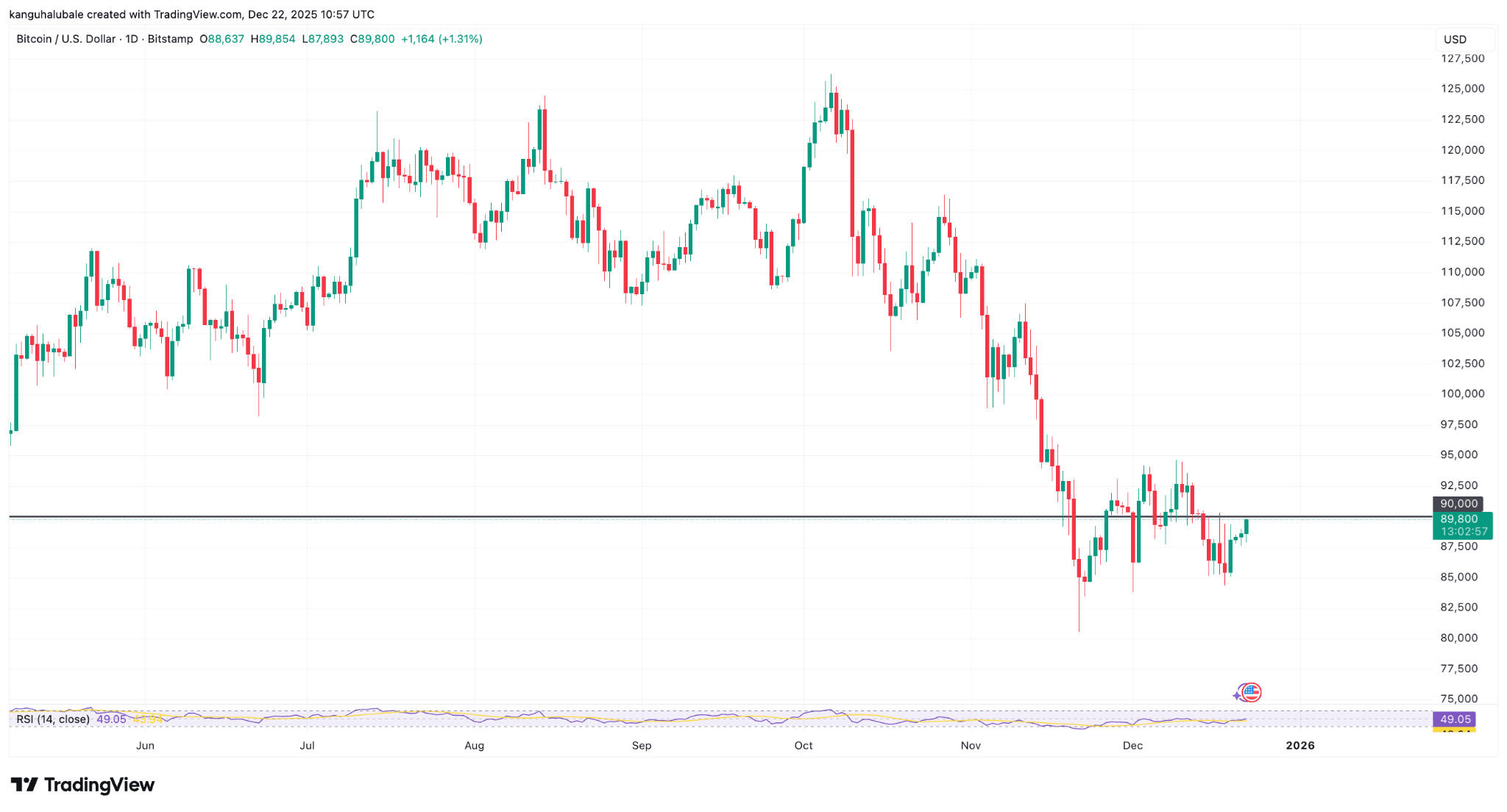 Bitcoin approaches $90,000 under the expectation of a 'Christmas rally', with derivatives and chart patterns turning bullish, targeting above $100,000.