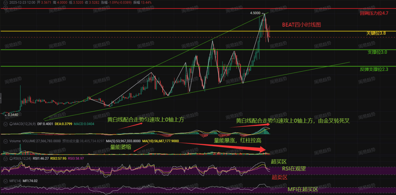 The conclusion is clear: I am bearish on BEAT in the short term. Today, I believe it is unlikely to truly reach 4.7; the greater probability is to turn downward under the resistance of 4.7, with the first target being the range of 3.8-3.0. If market sentiment deteriorates, it cannot be ruled out that it will test the strong support near 2.3.