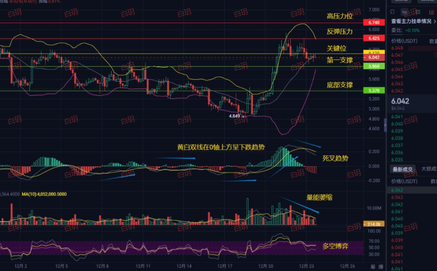 Take another look at the 4-hour chart. The current price is exactly at the "key level" of $6.042, where bulls and bears are locked in a fierce battle. Above, there is a heap of resistance between $6.6 and $6.74, like several towering mountains. Below, the first line of defense is at $5.86, and the real killer is the "bottom support" at $5.37.
