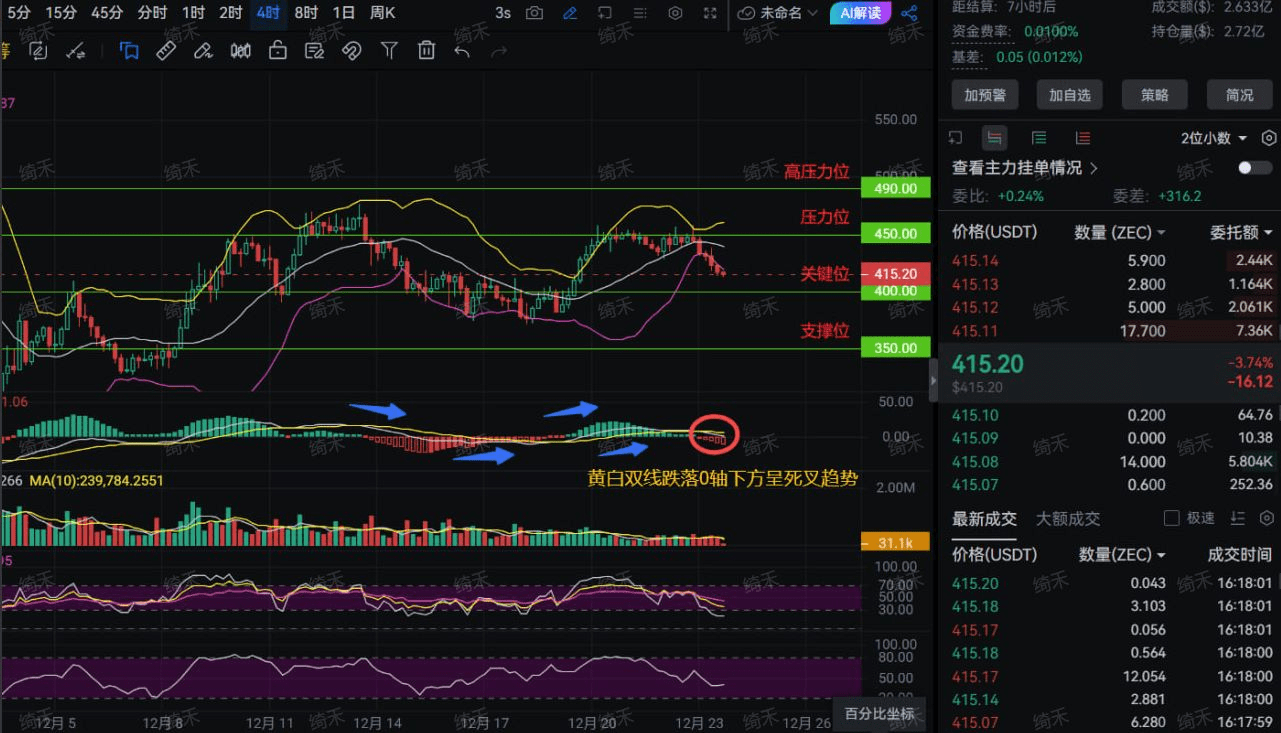 For those with light positions or empty positions looking to catch the bottom: Hold on! Don’t rush to catch falling knives. The real opportunity is to wait for it to drop thoroughly and stabilize. Pay attention to two positions: whether a clear rebound candlestick appears near 400; and the stronger area of 350. Don’t reach out until the position is right, and even when it is, enter in batches and tentatively.
