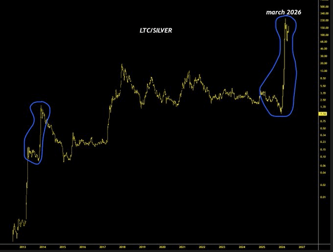 Long-term LTC/Silver structure suggests historical compression phases often precede sharp repricing cycles.
