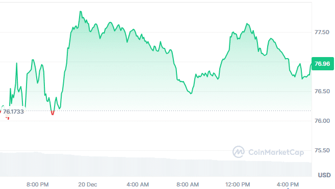 Litecoin on the 24-hour chart is stuck in a range after dropping out of the $120 region. Price has been ranging between $76 and $77.8 meaning that volatility is lower. This behavior suggests selling pressure has eased. Buyers appear selective rather than aggressive.