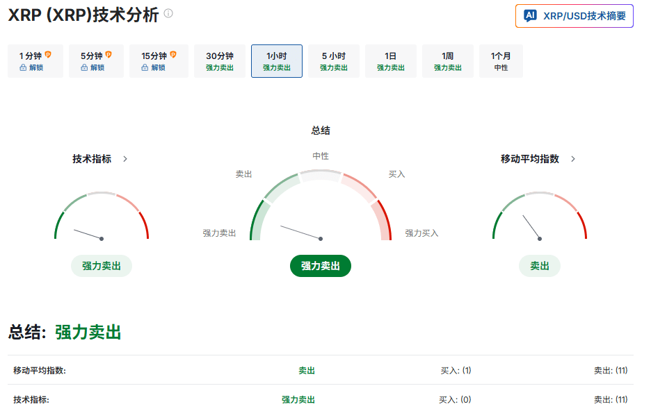 No matter how nice the news sounds, the 1-hour K-line chart won't lie. XRP is still in a clear downtrend, with technical indicators consistently showing 'strong sell' from 30 minutes to 1 week. It is now caught between several key positions: