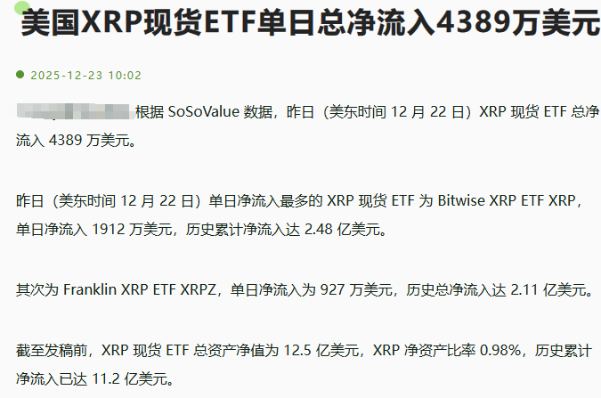 The hardest news today is: the US XRP spot ETF saw a net inflow of $43.89 million yesterday, with a total inflow exceeding $1.1 billion. This is indeed a solid long-term positive, indicating that large institutions are continuously buying in the bottom area.