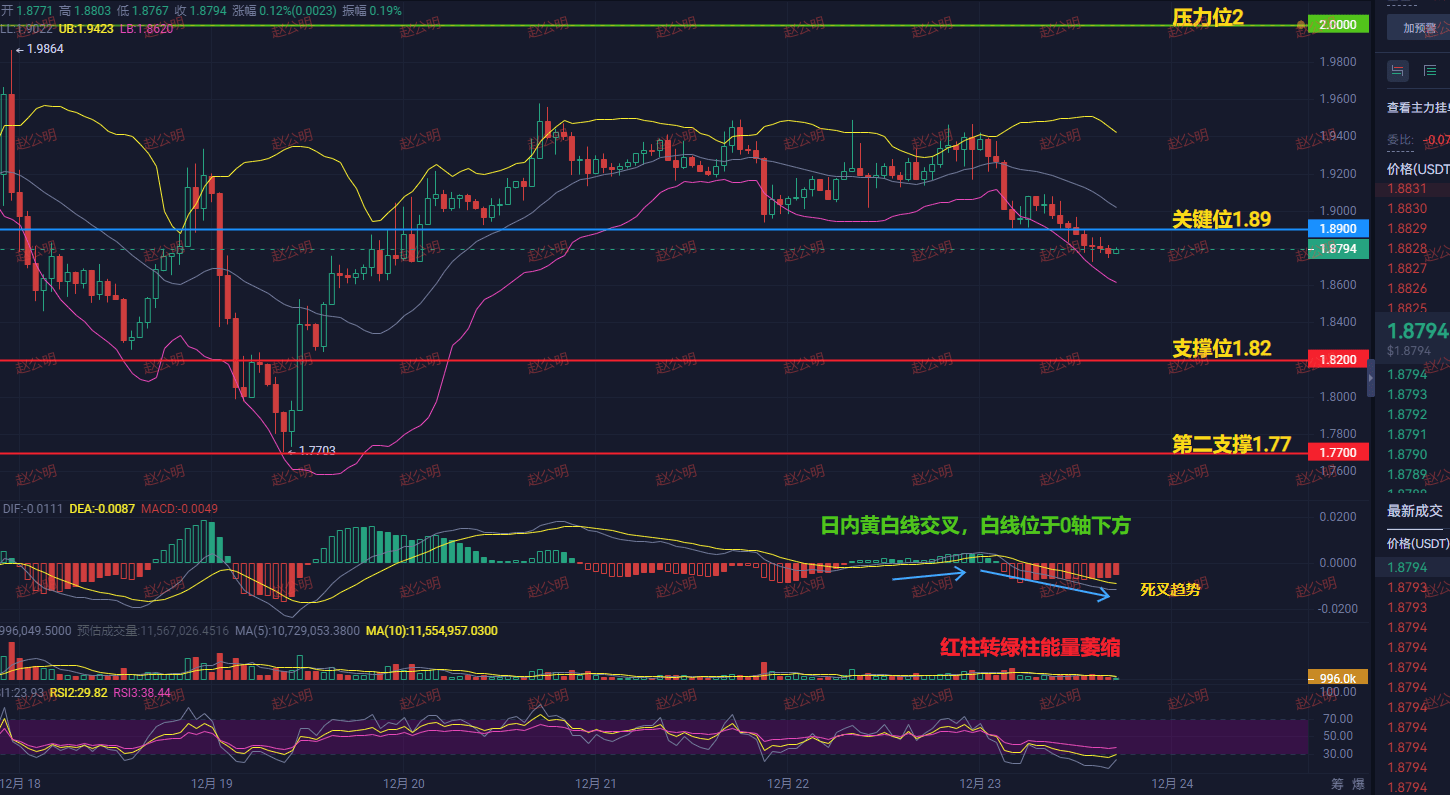 Zhao Gongming's judgment is clear: before the downtrend is reversed, ETF buying can only delay the decline and create fluctuations, but cannot immediately drive a reversal. XRP will likely experience a complex fluctuation between 1.77 and 1.89, using time to exchange for space.
