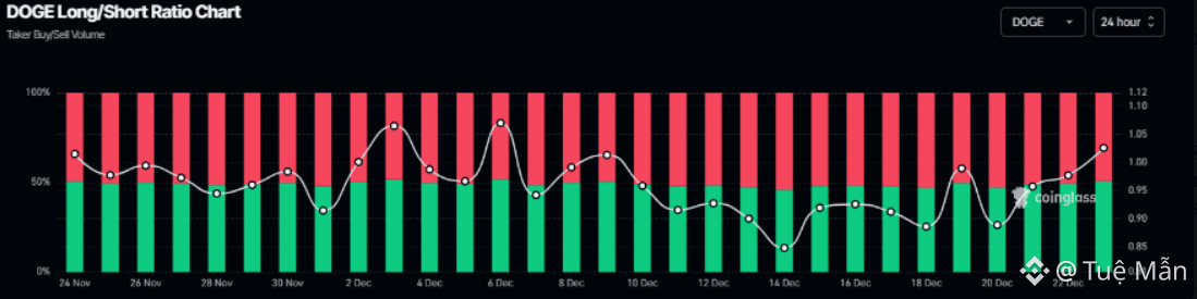Trên thị trường phái sinh, theo Coinglass, tỷ lệ long/short của DOGE đạt 1,02 vào thứ Ba, tiệm cận mức cao nhất trong tháng. Việc tỷ lệ này vượt ngưỡng 1 phản ánh tâm lý lạc quan ngày càng gia tăng, khi số lượng trader đặt cược vào kịch bản giá tăng đang áp đảo bên bán.