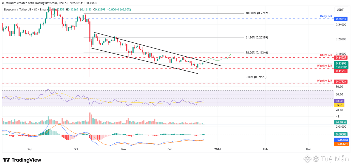 Trong trường hợp DOGE bứt phá dứt khoát mô hình cái nêm giảm — vốn thường được xem là tín hiệu ủng hộ xu hướng tăng — giá có thể mở rộng đà phục hồi lên vùng kháng cự ngày tại 0,14 USD. Nếu lực mua đủ mạnh giúp giá đóng cửa ổn định trên ngưỡng này, DOGE nhiều khả năng sẽ tiếp tục hướng tới mốc Fibonacci thoái lui 38,2% tại 0,16 USD.