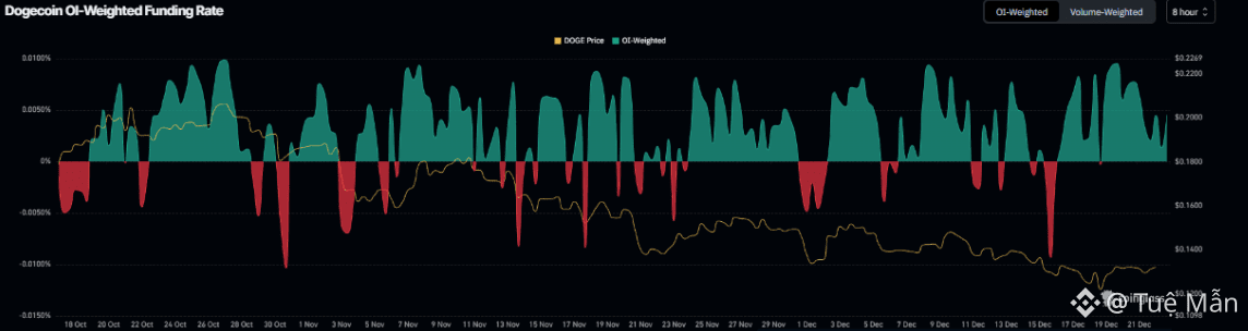 Đáng chú ý, dữ liệu funding rate cũng phát đi tín hiệu tích cực. Chỉ số OI-Weighted Funding Rate của Coinglass cho thấy số trader kỳ vọng DOGE tiếp tục giảm hiện thấp hơn nhóm dự đoán giá tăng. Funding rate đã đảo chiều sang vùng dương từ thứ Sáu và đạt 0,0045% vào thứ Ba, đồng nghĩa với việc các vị thế Long đang chấp nhận trả phí cho vị thế Short. Trong quá khứ, mỗi lần funding rate chuyển từ âm sang dương, giá Dogecoin thường ghi nhận những đợt tăng trưởng đáng kể.