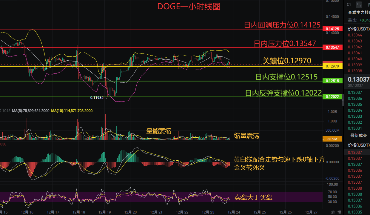 I believe DOGE will first test the support downwards, likely reaching 0.12515, and may even spike down to 0.12022. If there is a volume rebound at these two levels, short-term traders can speculate on a rebound. But remember: do not chase highs! The area above 0.13547-0.14125 is an excellent ambush zone for short positions.