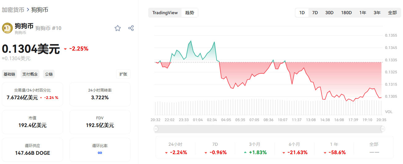 From the one-hour chart, DOGE is currently in a trend of decreasing volatility and downward movement. The MACD yellow and white lines are moving downwards at a steady pace below the 0 axis, and a death cross has formed, indicating that bearish momentum is still being released. There is significant resistance above: 0.14125 is the pullback resistance level, and 0.13547 is the intraday resistance level. Both of these positions are key areas for bearish strength.