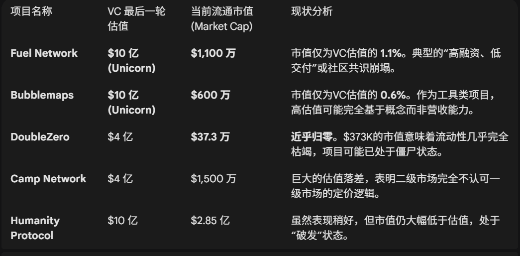 Among them, the VC valuations of Humanity Protocol, Fuel Network, and Bubblemaps are all $1 billion, but their current market values are only $285 million, $11 million, and $6 million, respectively.