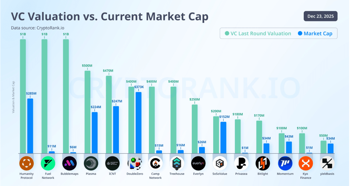 Projects like Plasma, ICNT, DoubleZero, Camp Network, and Treehouse have market caps far below their VC valuations, at $224 million, $247 million, $373,000, $15 million, and $16 million respectively.