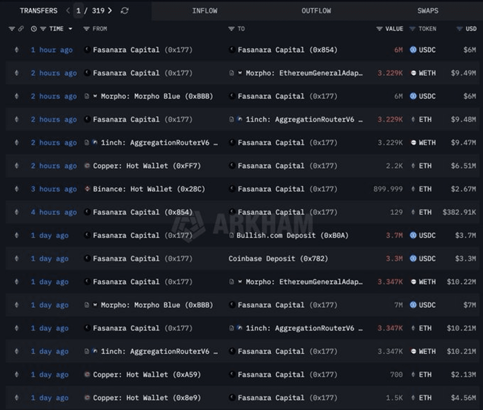 Fasanara Capital bought 6,569 ETH (~$19.72 million), deposited it in Morpho, and borrowed 13 million USDC to buy more ETH (leverage through ETH collateral).