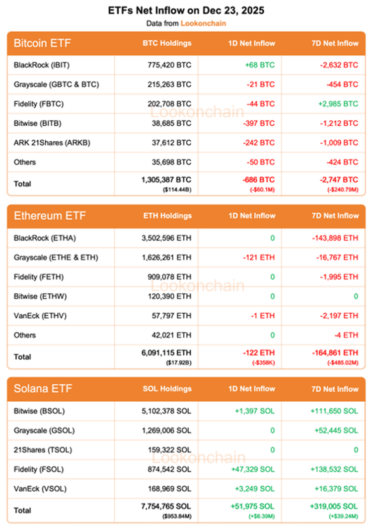 For the day/week: outflows from BTC ETF ($60.1 million / $240.8 million), from ETH ETF ($0.358 million / $485 million); meanwhile, SOL ETF is in the positive ($6.39 million / $39.24 million), December inflows into SOL ETF > $95 million.