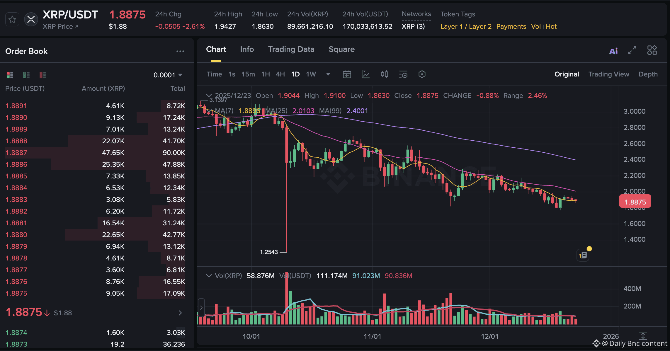 XRP declined 2.4% over the past 24 hours, underperforming the broader crypto market at -2.6%. The token fell below the key $1.90 area, accelerating downside momentum during thin holiday liquidity.