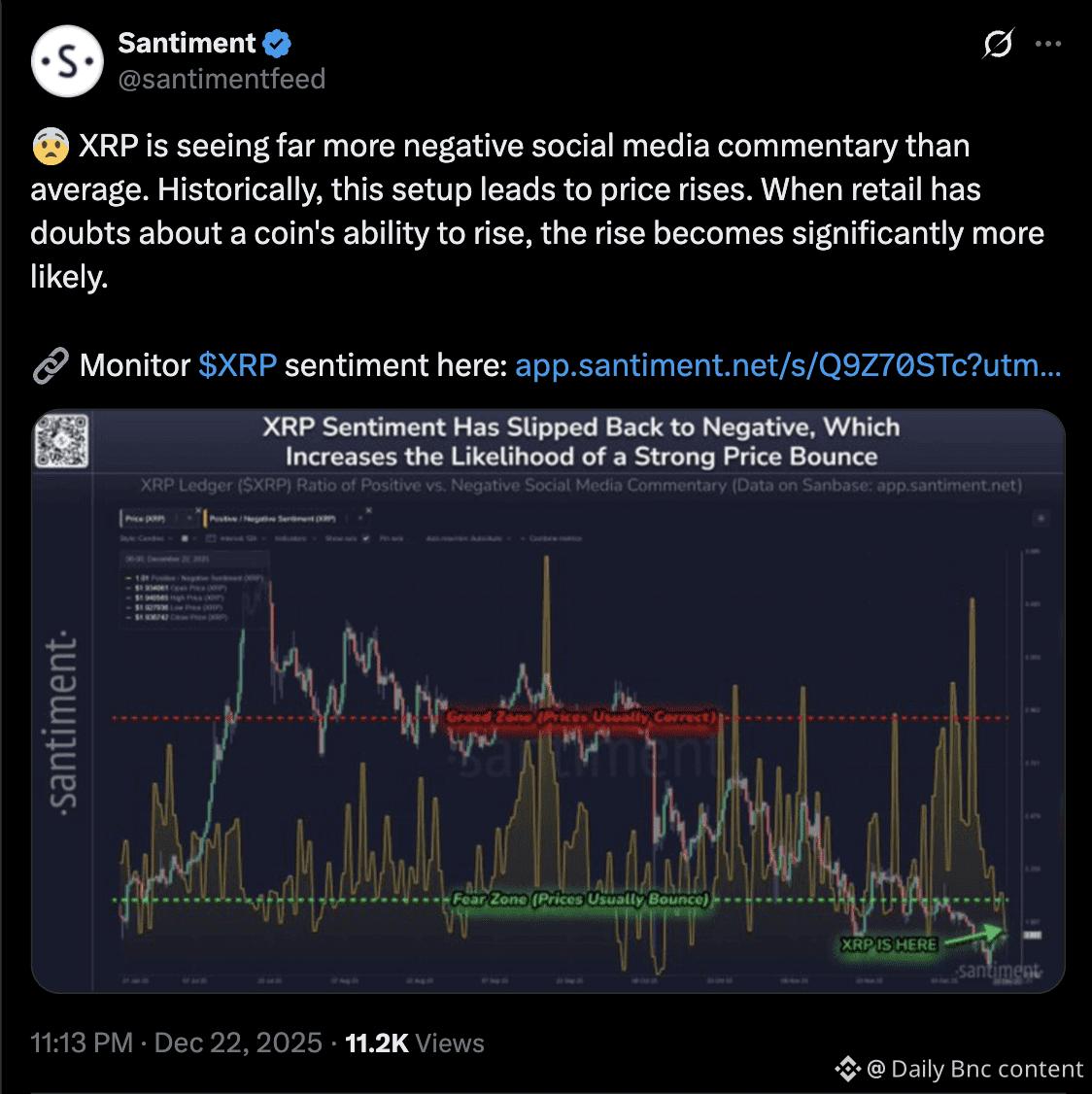 Market data shows extreme negative sentiment dominating XRP-related discussions. According to Santiment, metrics indicate bearish social chatter at levels last seen in November this year, a period that preceded a sharp rebound.