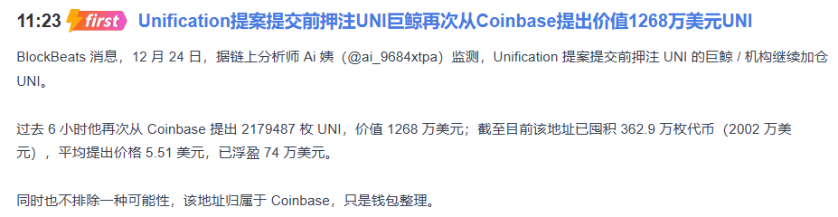 Today, a giant whale/institution withdrew nearly 12.9 million USD worth of UNI from Coinbase within 6 hours. What are the key details?