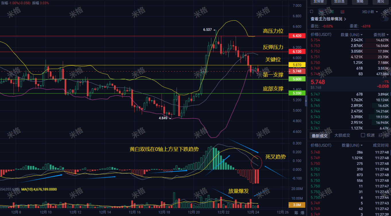 The upper level of 6.12 is a key resistance point, and 6.42 is a strong upper pressure, like two mountains. The lower level of 5.6 is the first line of defense, and 5.33 is the lifeline. The most crucial indicator—MACD, with the yellow and white lines crossing downwards above the 0 axis, is a typical 'bullish momentum exhaustion' signal, indicating that the upward momentum is fading, and the adjustment is not over.