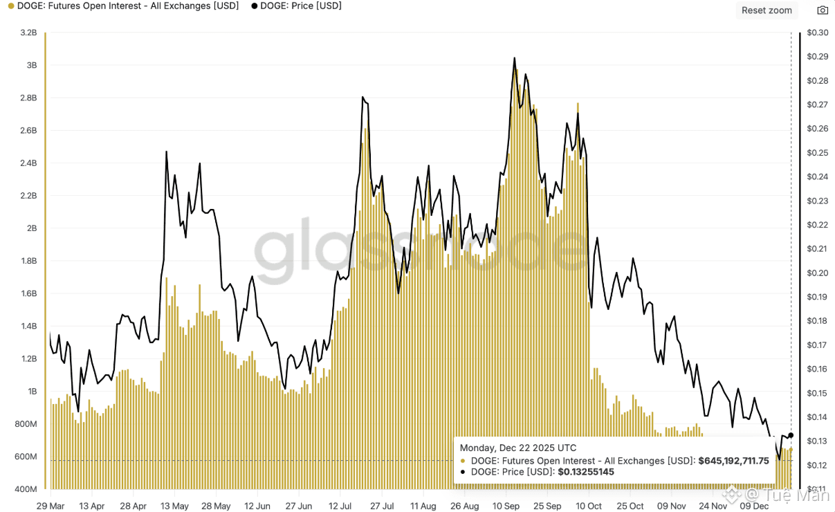 Thị trường phái sinh của Dogecoin tiếp tục rơi vào trạng thái trầm lắng kéo dài kể từ cú sụt giảm mạnh ngày 10/10, thời điểm làn sóng thanh lý đòn bẩy diễn ra trên diện rộng. Dữ liệu từ Glassnode cho thấy tổng hợp đồng mở (OI) của các hợp đồng tương lai Dogecoin trên toàn bộ sàn giao dịch chỉ đạt khoảng 645 triệu USD vào thứ Hai, nhích nhẹ so với mức 640 triệu USD của ngày trước đó, nhưng vẫn cách rất xa mốc 1,5 tỷ USD ghi nhận trong ngày xảy ra cú lao dốc.