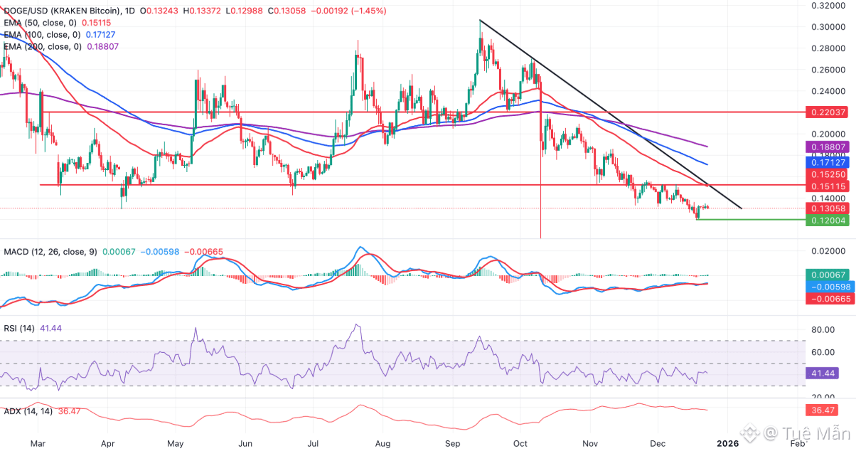 Tại thời điểm bài viết được thực hiện vào ngày thứ Tư, Dogecoin đang dao động quanh mốc 0,13 USD nhưng vẫn chịu áp lực rõ rệt khi giá liên tục bị kìm hãm bên dưới các đường trung bình động quan trọng. Cụ thể, DOGE hiện giao dịch thấp hơn đường EMA 50 ngày tại 0,15 USD, EMA 100 ngày tại 0,17 USD và EMA 200 ngày tại 0,19 USD — một tín hiệu cho thấy cấu trúc kỹ thuật tổng thể vẫn nghiêng về xu hướng giảm.