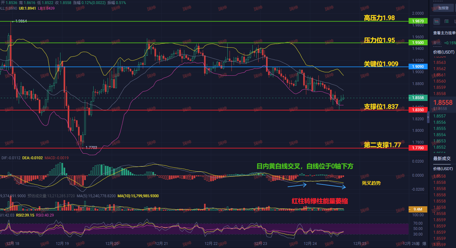 Rui Shen believes that XRP is unlikely to break through 1.909, and it is more likely to drop below the support of 1.837, testing the second support level at 1.77. The logic is: the technical bearish pattern is complete, continuous outflow of funds, and the ETF benefits have not stimulated buying pressure—this is a case of 'not rising when it should, hence bearish.'
