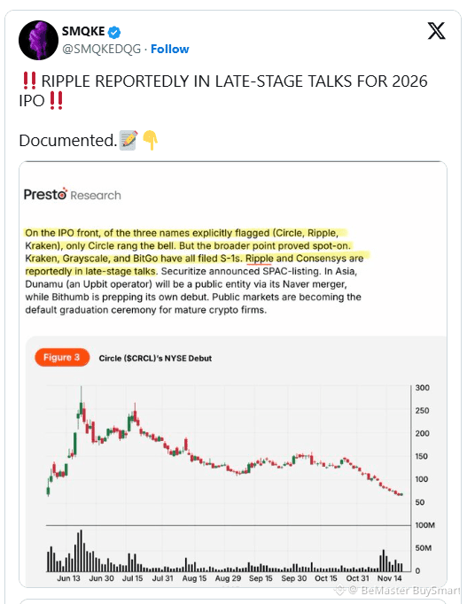 The material referenced by SMQKE includes a highlighted excerpt from a Presto Research report examining the current IPO landscape for major crypto companies. The research notes that while Circle has already completed its debut on the New York Stock Exchange, several other firms, including Kraken, Grayscale, and BitGo, have filed registration statements. Within this context, Ripple and Consensys are purportedly in late-stage talks.