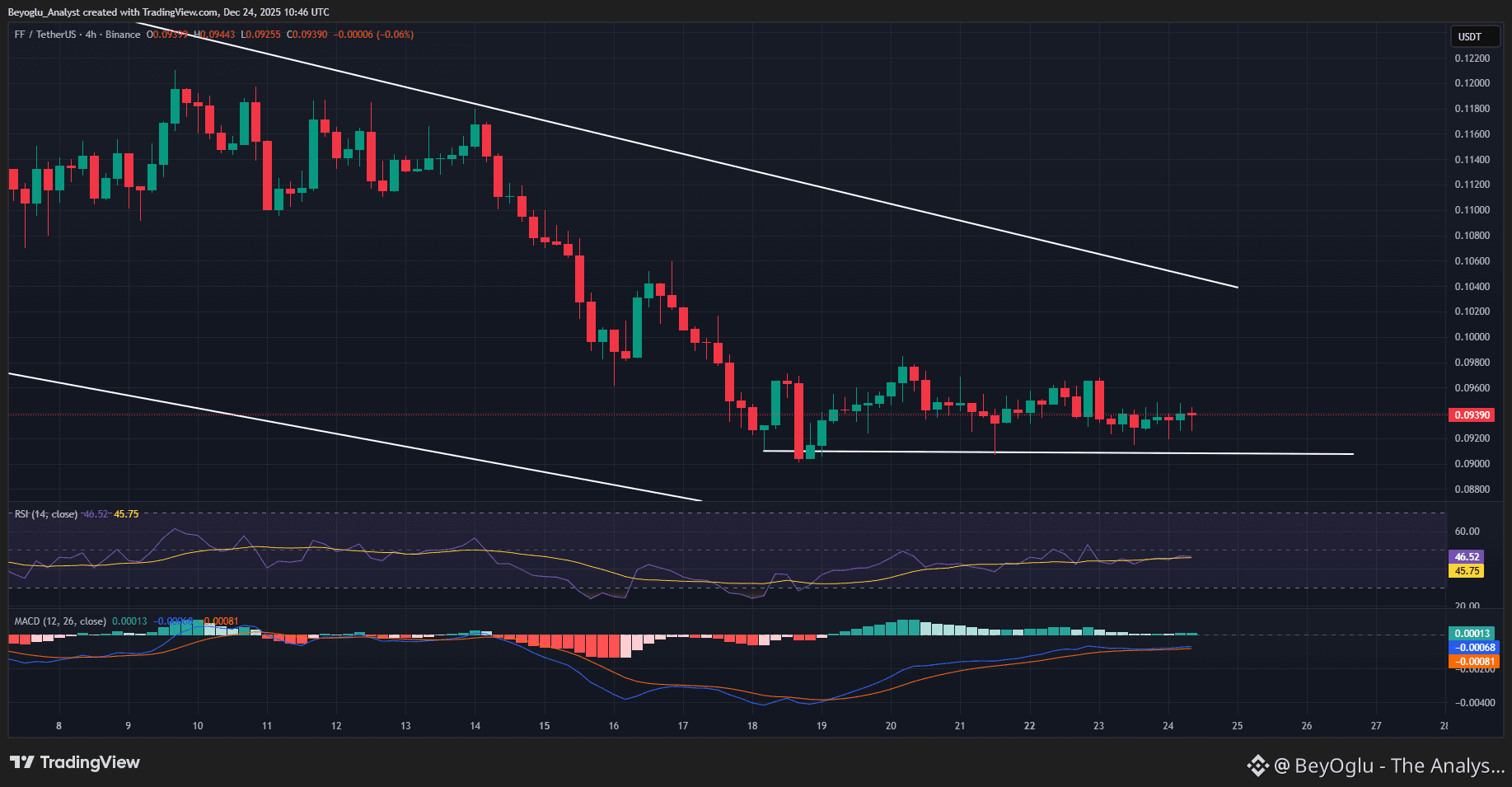 At the time of writing this on Wednesday $FF coin is trading near 0.094$. The longer the consolidation is the breakout or breakdown will more stronger. The long it will consolidate the stronger breakout it will make, Same for for breakdown as it consolidating above the support price and not making the pullback.