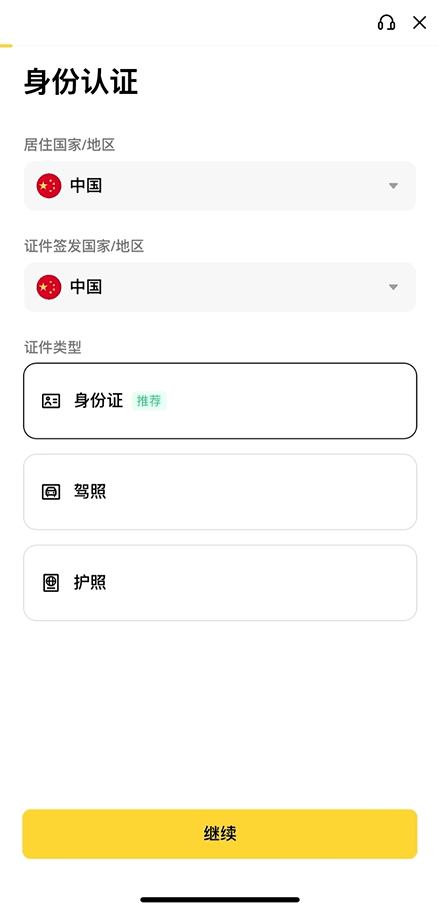 There's no need to worry, whether it's the country of residence or the country of document issuance, you can choose 'China' for both parts. The restrictions are minimal for China. Even if you are currently abroad, you may be specifically residing in Argentina, but if you have a Mainland China ID, you can choose 'China' for both your residence and document issuance country. The Chinese document is the best for identity verification in cryptocurrency exchanges. Then we can choose to use the ID card for verification.