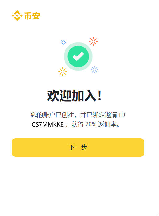 At this point, our Binance account has been successfully registered. It will ask us, 'Do you have an inviter?' Here, we must select 'Yes', and then we can fill in CS7MMKKE in the inviter ID. Using this inviter ID for registration will allow us to enjoy a permanent 20% fee discount on future transactions. Click [Next].