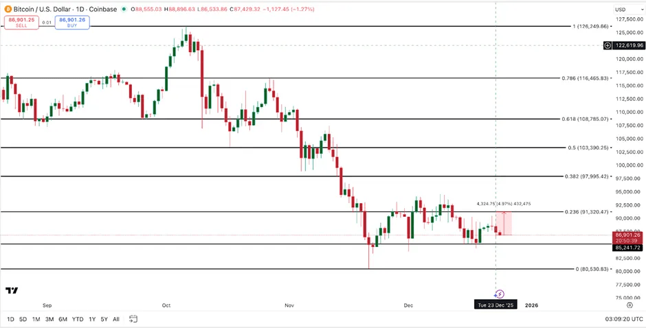 From current prices, Bitcoin needs to rise by approximately 5% to reach that area. Just above $91,300, Bitcoin avoids ending the year clearly in the red.