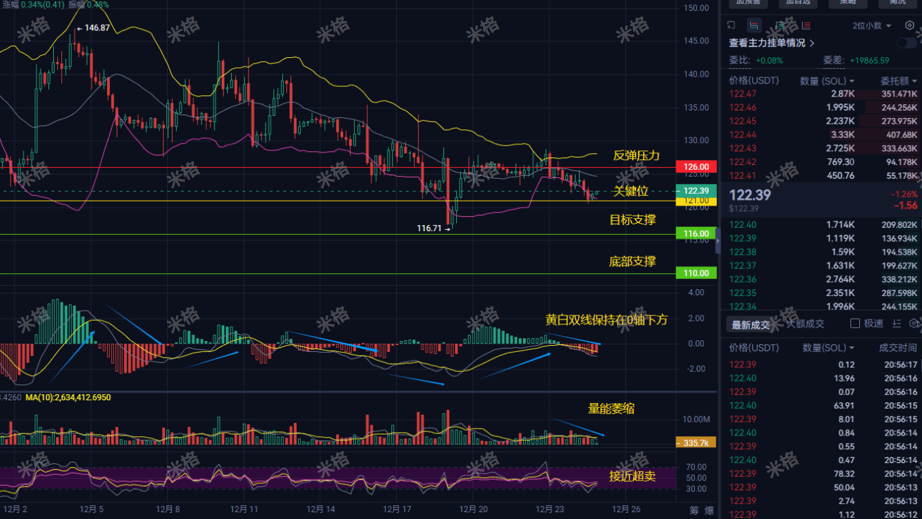 Currently, SOL is stuck at 122.39, with the MACD double lines firmly below the 0 axis; this is standard for a bearish pattern.