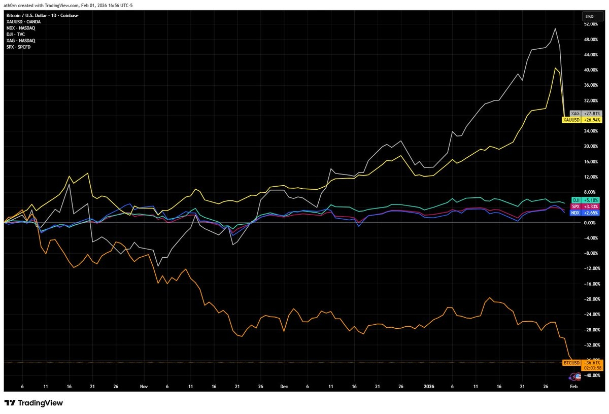 Currently, Bitcoin has dropped by 38% from its historical high of 126,000 in October 2025.
