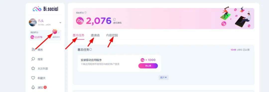 6. Get 1,000 points for the SocialFi project bi social. You can get points by verifying tweets, DCs, downloading APPs, mint IDs, and inviting friends. It can be said to be a famous brand airdrop, and it is relatively popular: