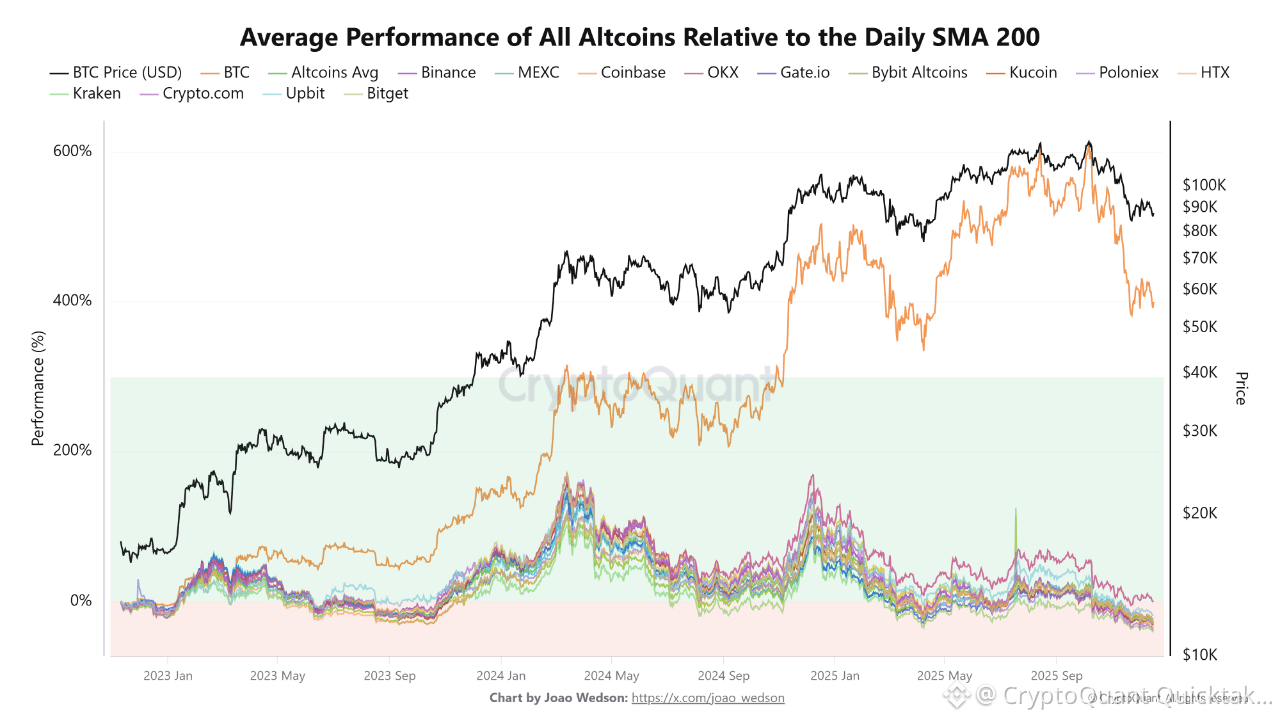 the average performance of altcoins shows a sharp decline of approximately -27% relative to the 200-day simple moving average (SMA), reflecting a widespread weakening of risk appetite toward alternative assets. This divergence confirms that recent market rallies have been driven primarily by Bitcoin rather than by a balanced, broad-based market advance.