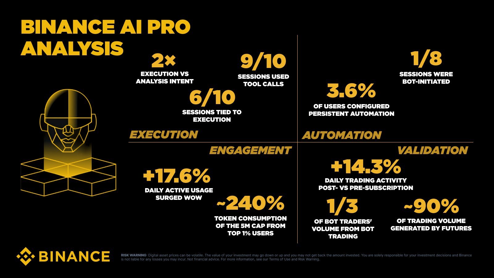 Over the observed period from March 25, 2026 to April 15, 2026, Binance Ai Pro distinguished itself as an execution-oriented AI agent rather than a traditional chatbot. The data signaled steady growth in user engagement, autonomous workflows are already in use, and trading activity improves after adoption. Although autonomous activity and bot-initiated trading are still in early stages, the data suggests that advanced adopters are continuing to accelerate the usage.