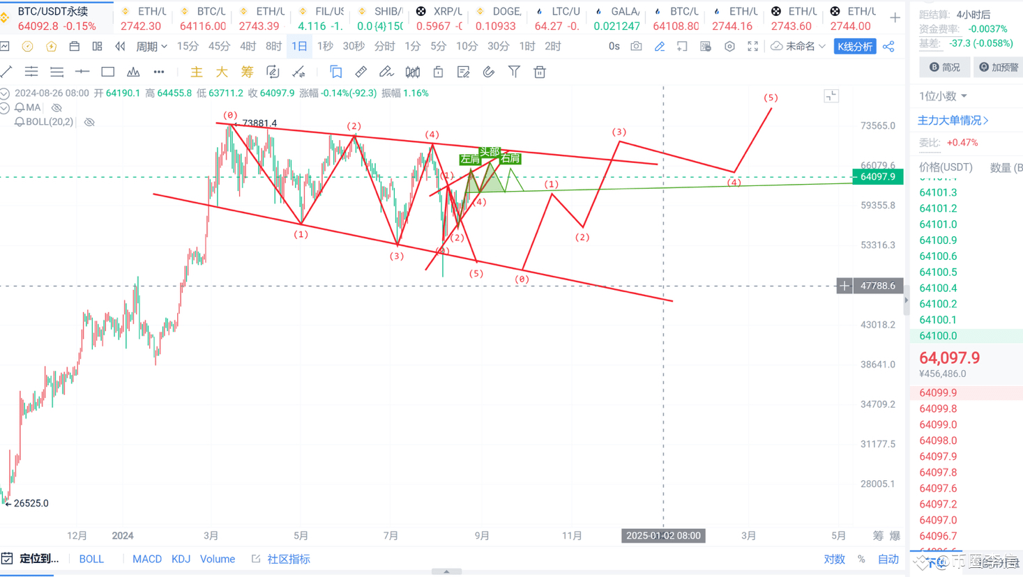 (1) The current trend is more like a 3-3-5 platform structure. Structurally, this is a relay structure. Even if the price can create a new high here, from this perspective, it can only move in a small wave pattern and cannot support more waves. Therefore, from this perspective, 65,000 is not the highest point, but the second highest point, and even if there is a higher point, it will not be too far from the second highest point.