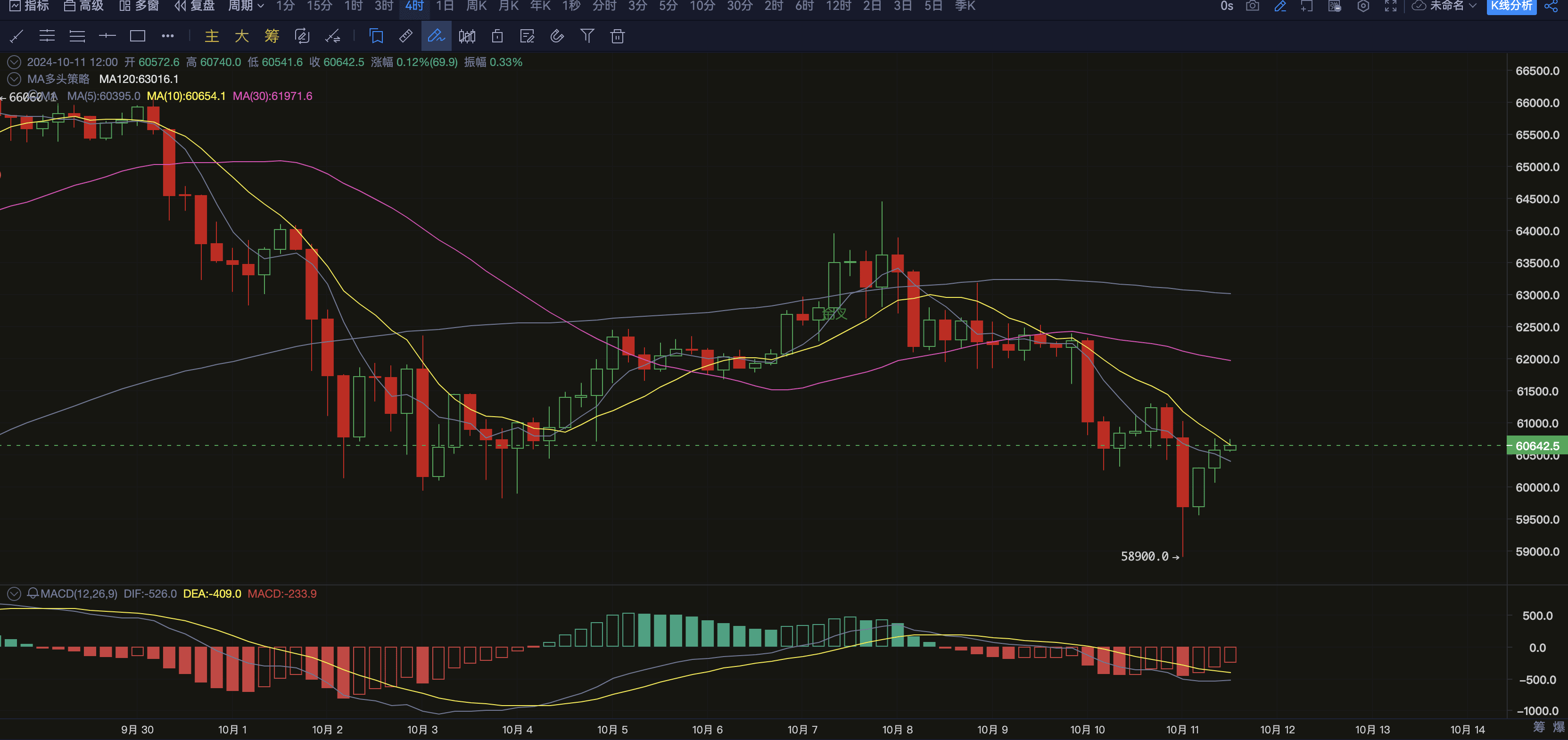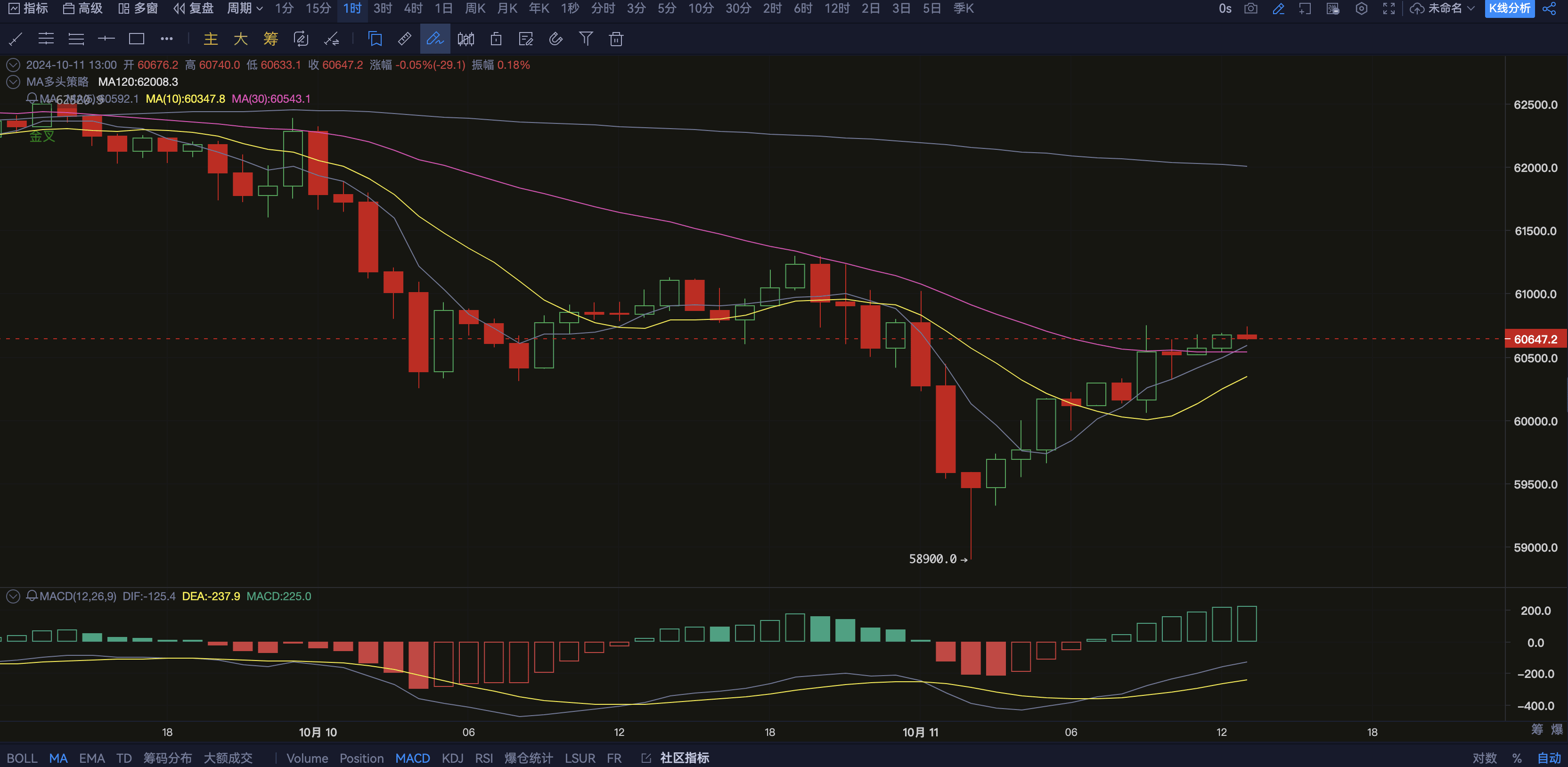 From the four-hour chart, Bitcoin has been fluctuating and weakening since it surged above $62,000 in early October. The current price has fallen below the MA60 moving average ($61,411) and is hovering around $60,600. The short-term market direction is still unclear.
