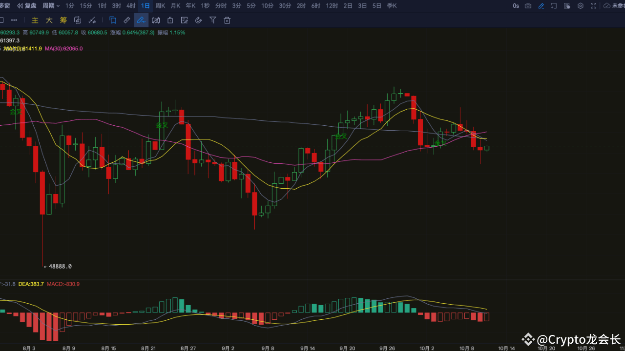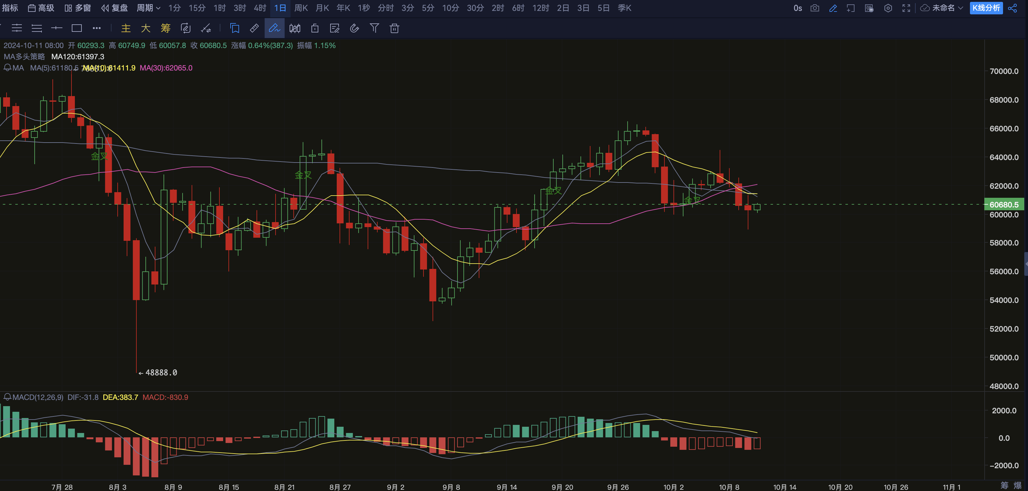 From the daily chart of Bitcoin (BTC), the current price is $60,657, and the overall market is showing a fluctuating trend. Since hitting a low of $48,888 in early August, Bitcoin has gradually rebounded and successfully broke through the strong resistance level of $62,000 in mid-September. However, affected by the short selling pressure from above, the price failed to stand above $62,000 and fell back.
