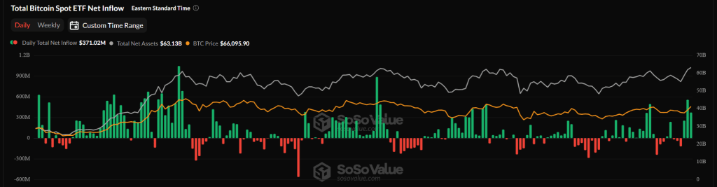 On October 15, the Bitcoin spot ETF saw an inflow of $371 million. Currently, US Bitcoin spot ETFs hold a total net asset of $63.13 billion, or 4.80% of the total Bitcoin supply. Among the market leaders, IBIT BlackRock saw an inflow of $288.84 million yesterday.