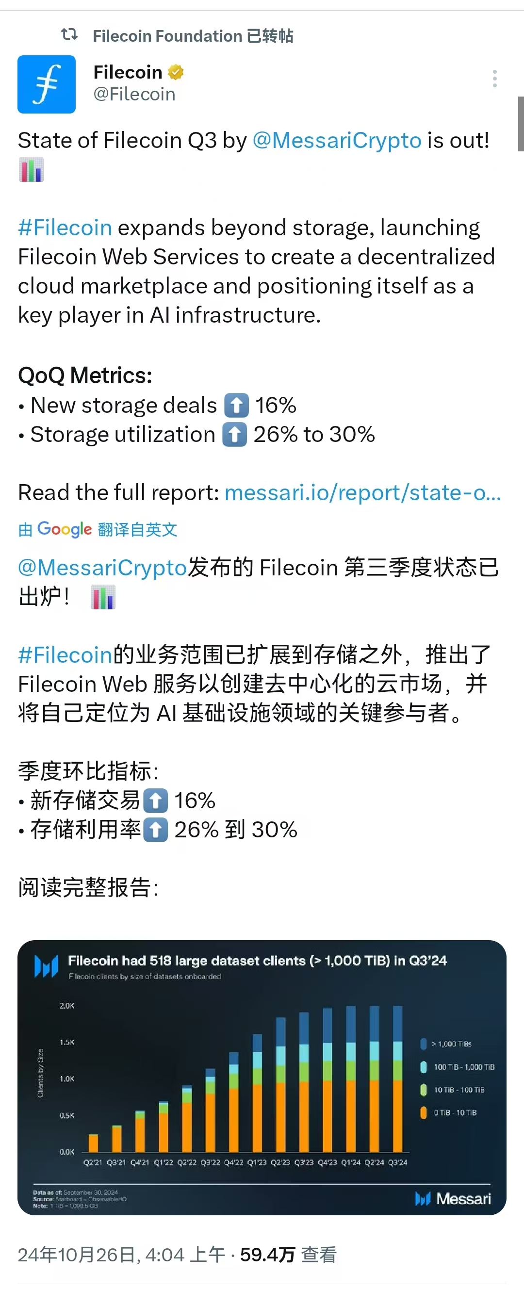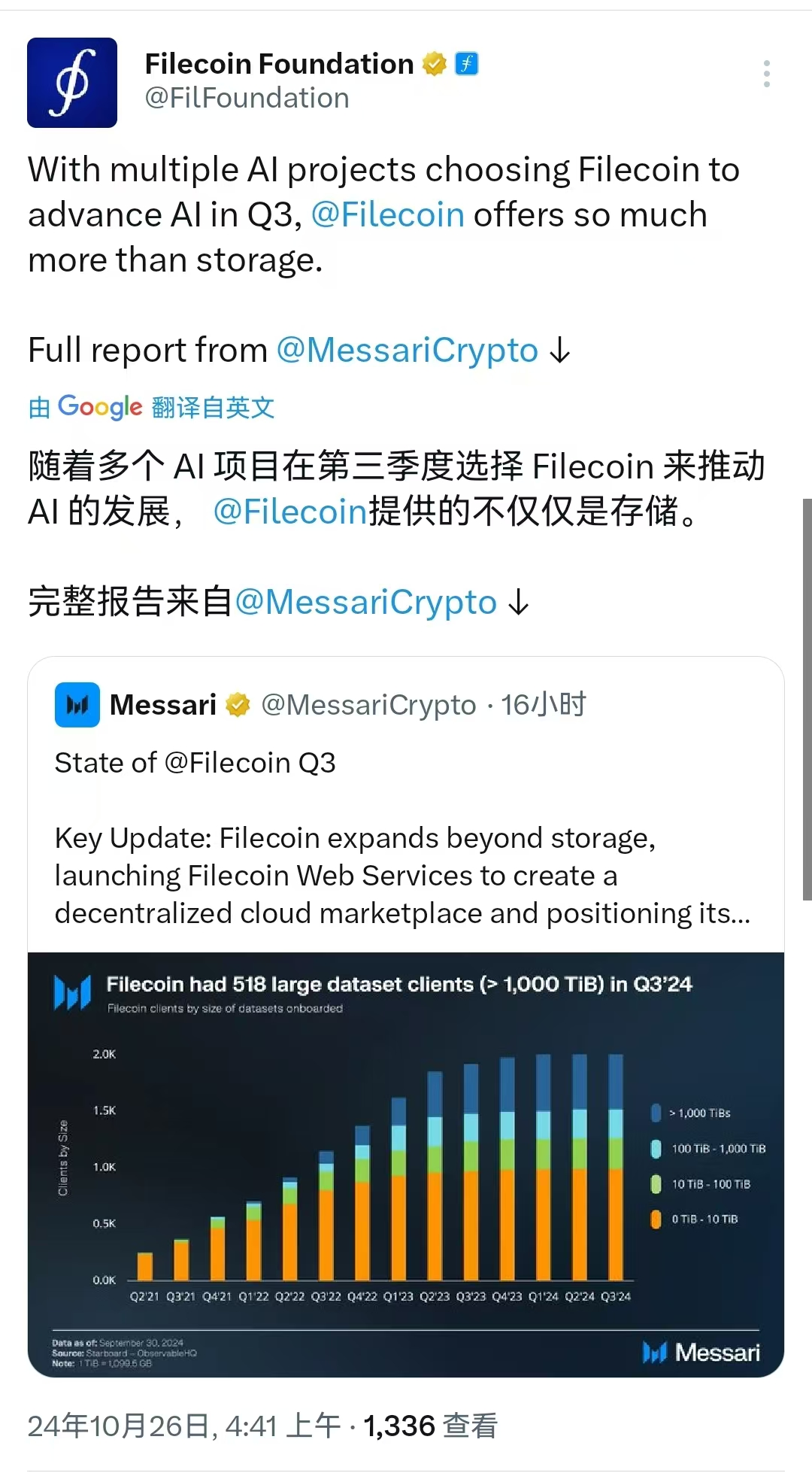 #filecoin This article details Filecoin's performance in storage, technical expansion, decentralized finance (DeFi), and collaborations with enterprises in the third quarter of 2024 (Q3’24). The article emphasizes Filecoin's achievements in decentralized storage and new services (such as Filecoin Web Services - FWS) and attempts to demonstrate how Filecoin is gradually expanding from simple storage solutions to broader data services and computing capabilities.