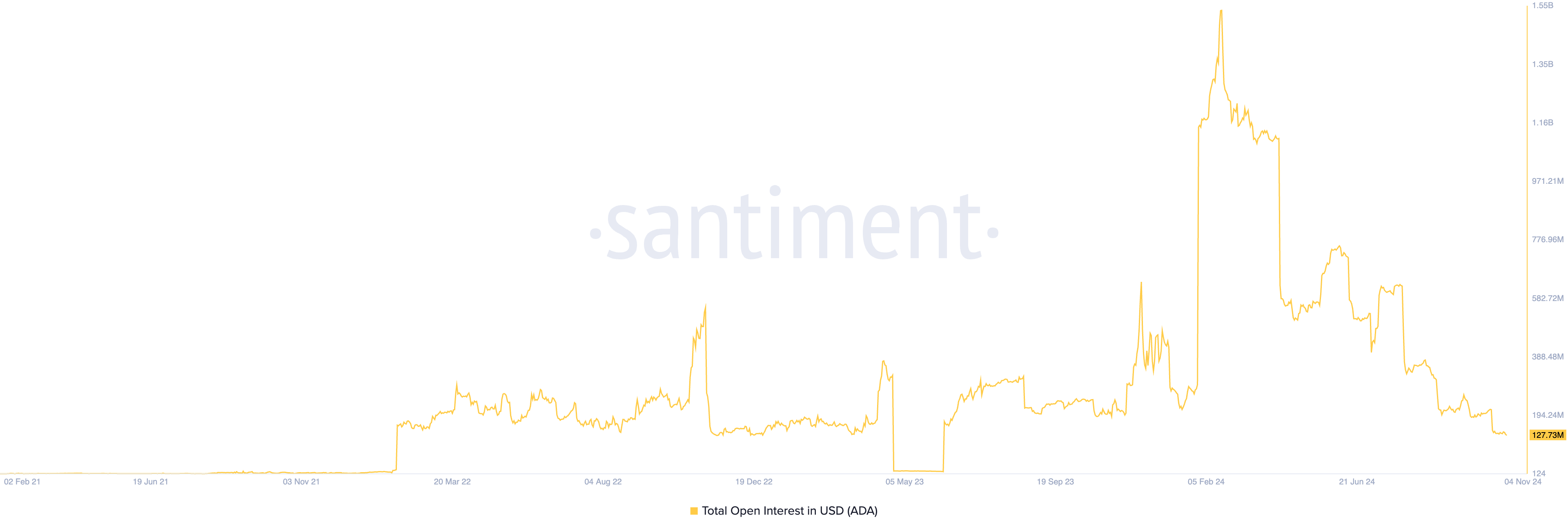 This stagnation has been accompanied by a significant drop in open interest (OI) in the cryptocurrency. At the time of writing, the figure stands at $128 million, down 80% from early August. OI values are now at their lowest since May 2023.